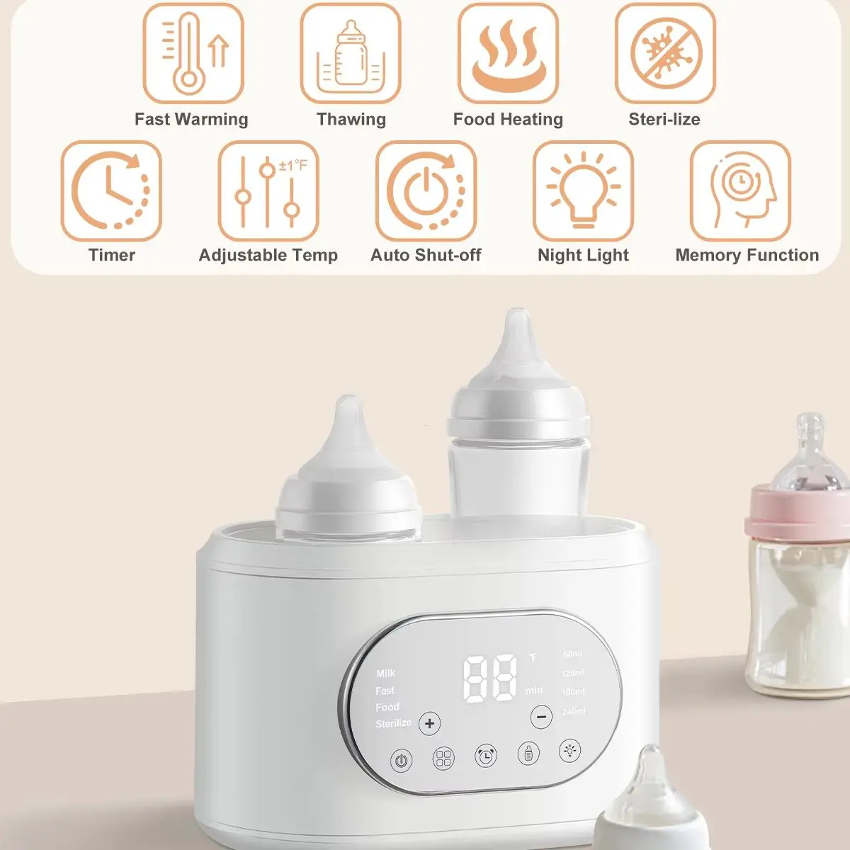 Fast Steaming / Water Bath Warming / 24H Keep Warm / Thaw / Steam / Food Heating / Adjustable Timer / Adjustable Temp / Memory Function / Night Light Feeding. This multifunction bottle warmer is ideal for twin families. A double bottle warmer is enough to meet all your daily feeding needs and save space and budget.